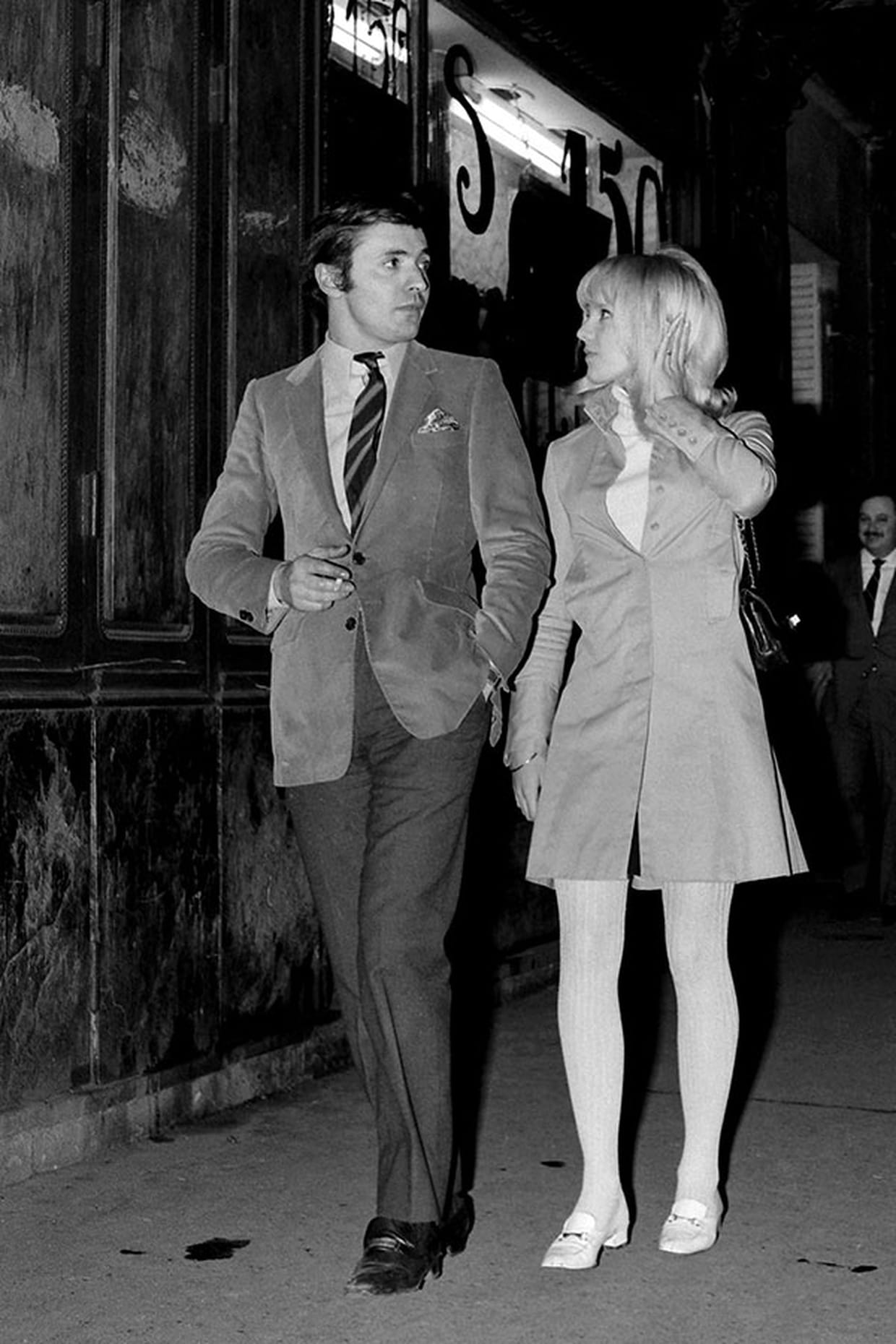 Sylvie Vartan en robe-manteau babydoll avec Charles Glenn à Paris en 1983.