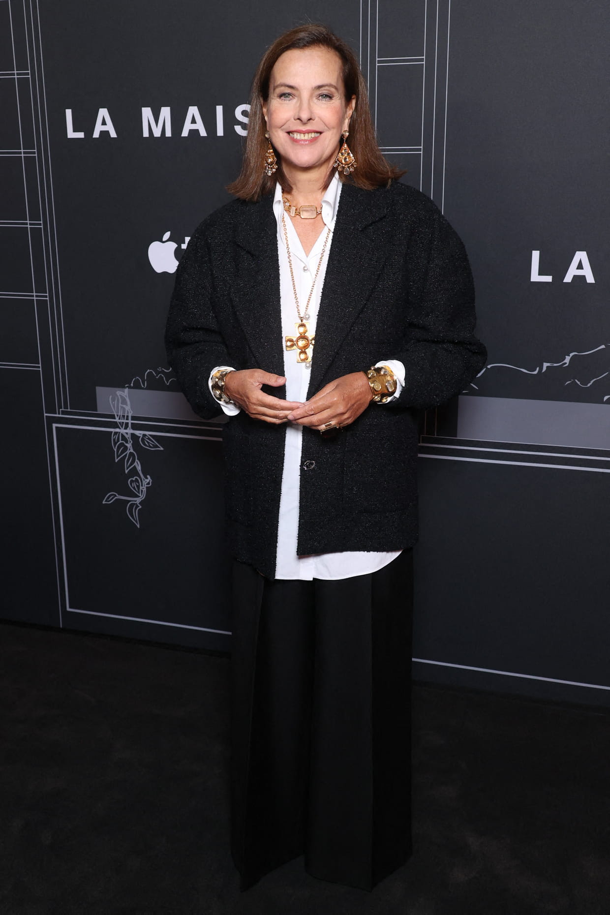 Carole Bouquet en longue chemise blanche et veste noire, accessoirisées de deux pendentifs en or, lors de la première parisienne de la série Apple TV+ La Maison, le 12 septembre 2024.