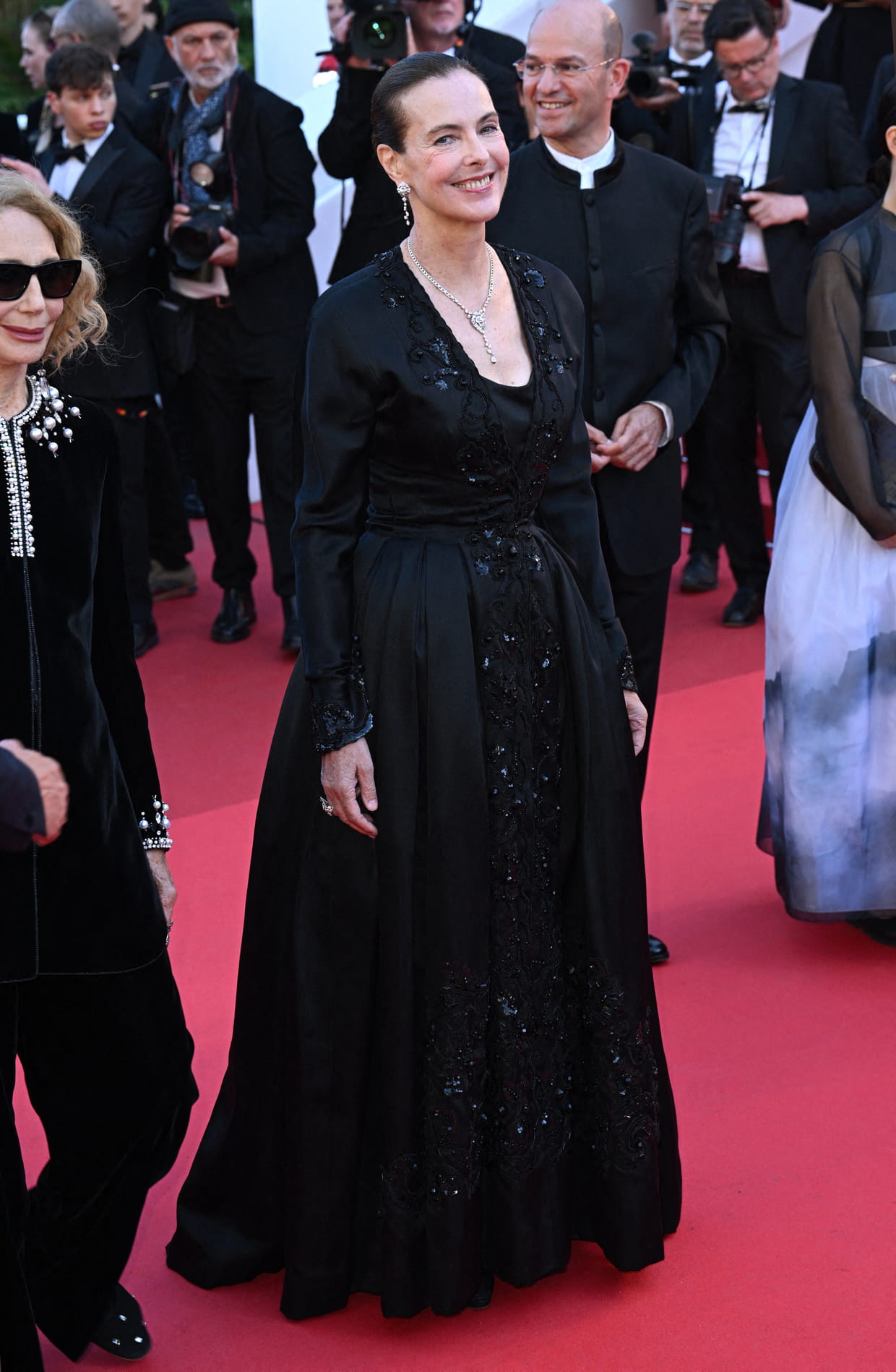 Carole Bouquet en robe de princesse noire signée Chanel à la 78e édition du Festival de Cannes, le 23 mai 2025.