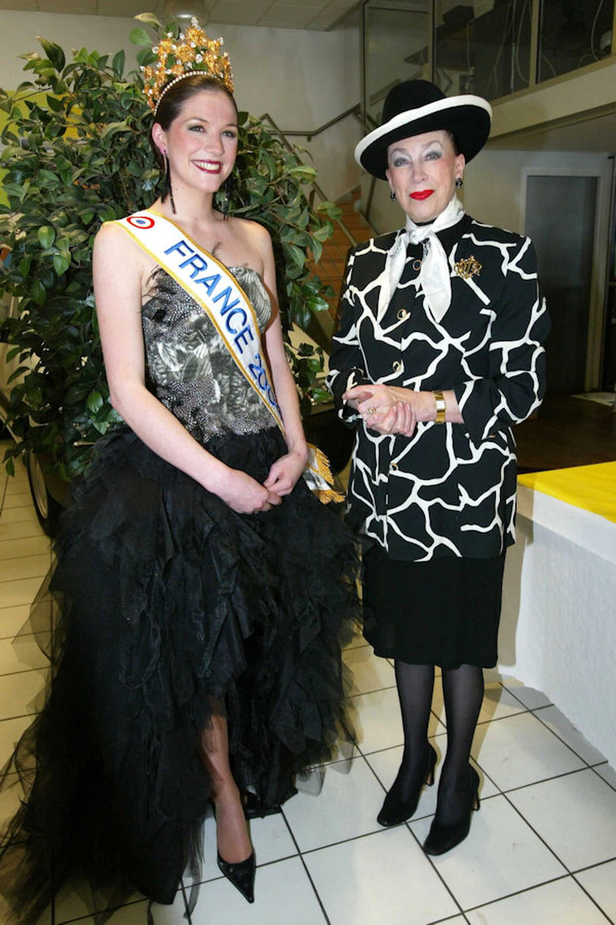 Geneviève de Fontenay en chapeau bicolore et veste imprimée noir et blanc avec Lucie Degletagne le 28 avril 2005.