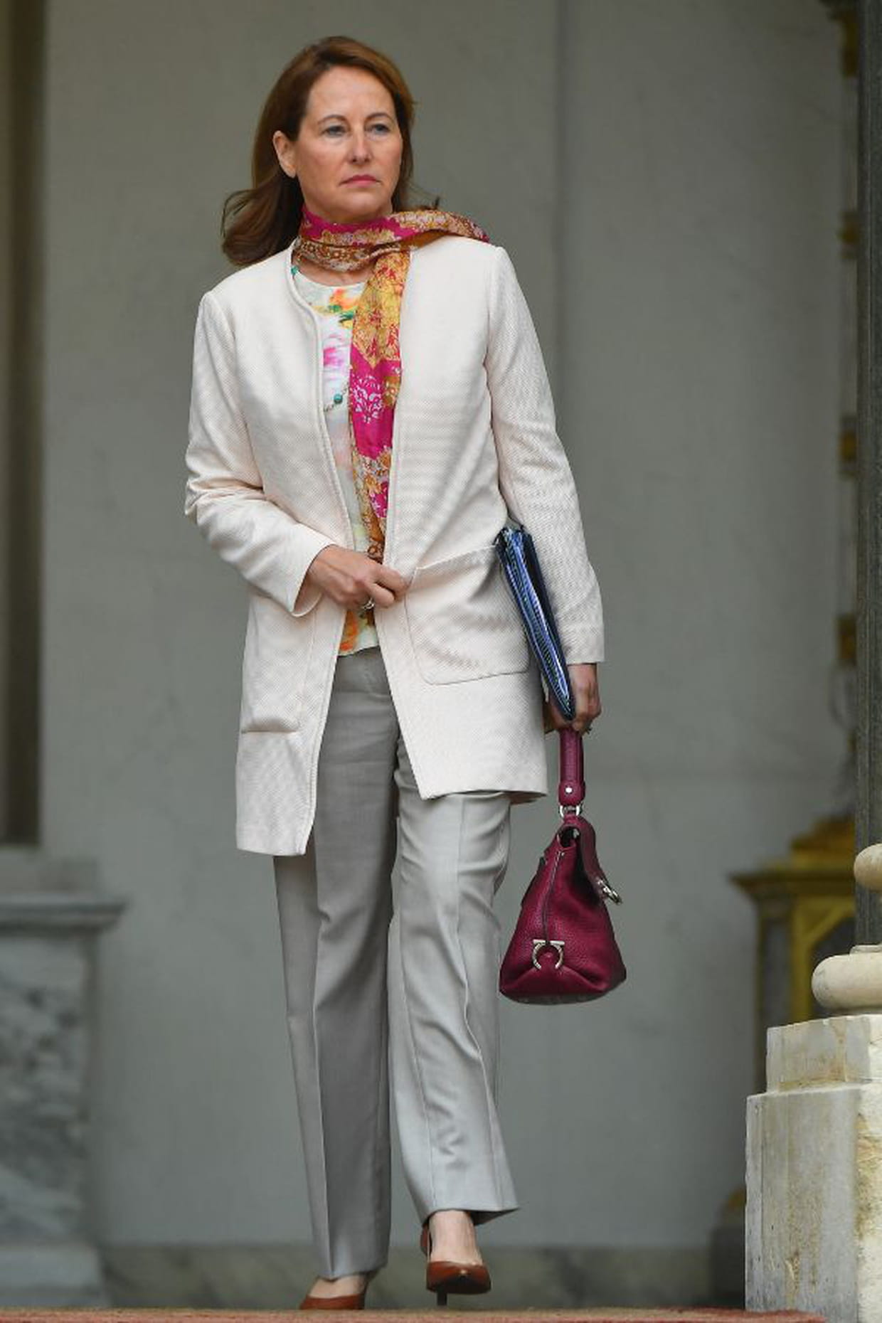Ségolène Royal en manteau crème et foulard coloré à une réunion à l'Élysée à Paris le 3 mai 2017.