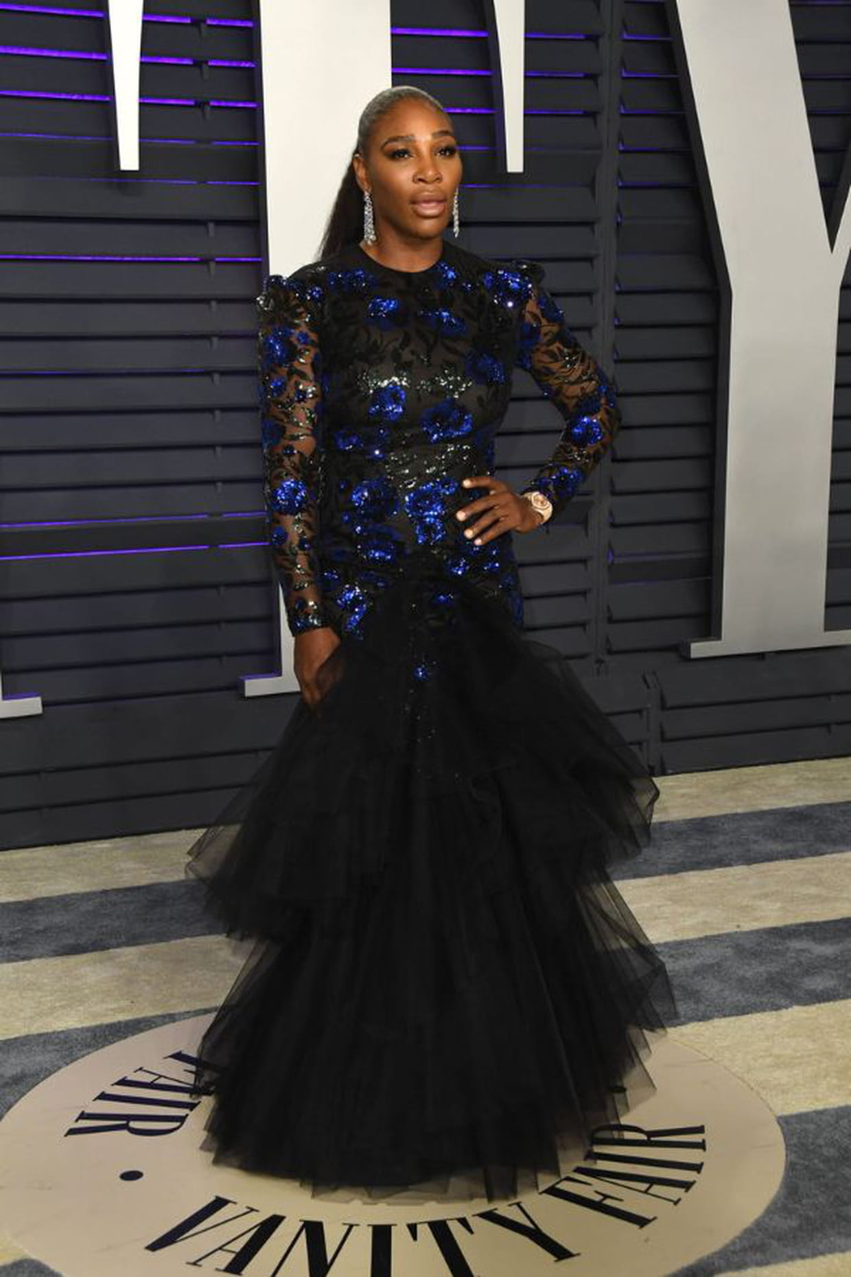 Serena Williams en robe bleu et noir à détails de paillettes et de tulle à la soirée Vanity Fair organisée en marge de la 91ème cérémonie des Oscars à Los Angeles le 24 février 2019.