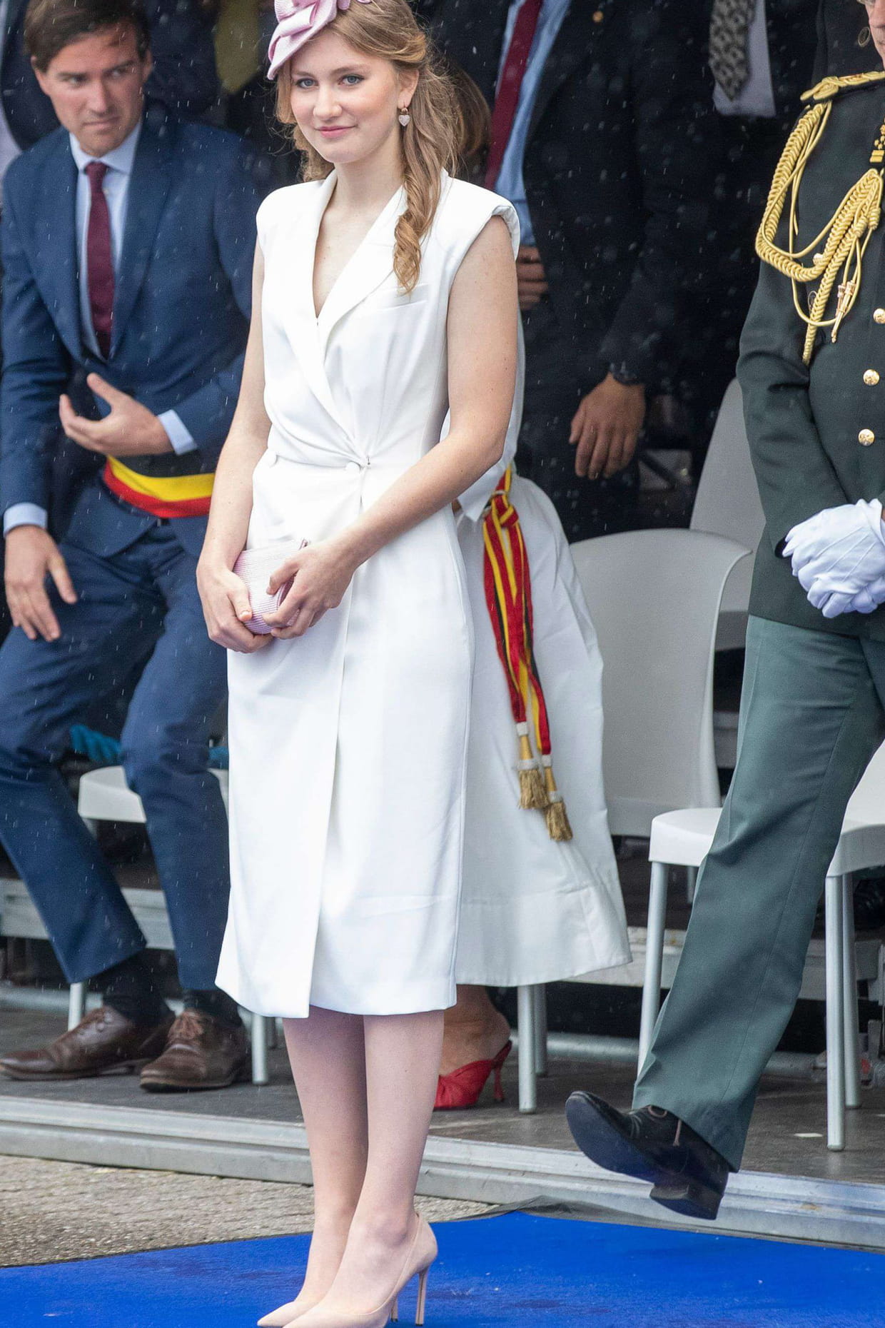 Élisabeth de Belgique en robe blanche au décolleté en V  lors d'une cérémonie royale à Bruxelles le 25 juin 2022.