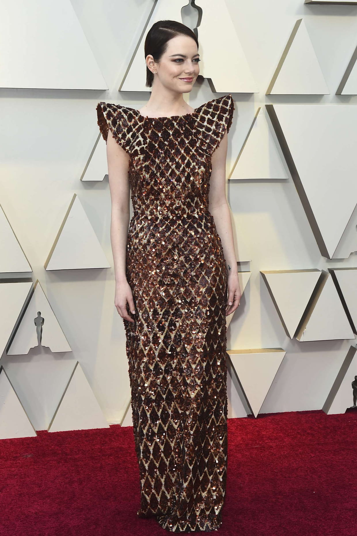 Emma Stone en robe longue dorée lors de la soirée des Oscars à Los Angeles le 24 février 2019.