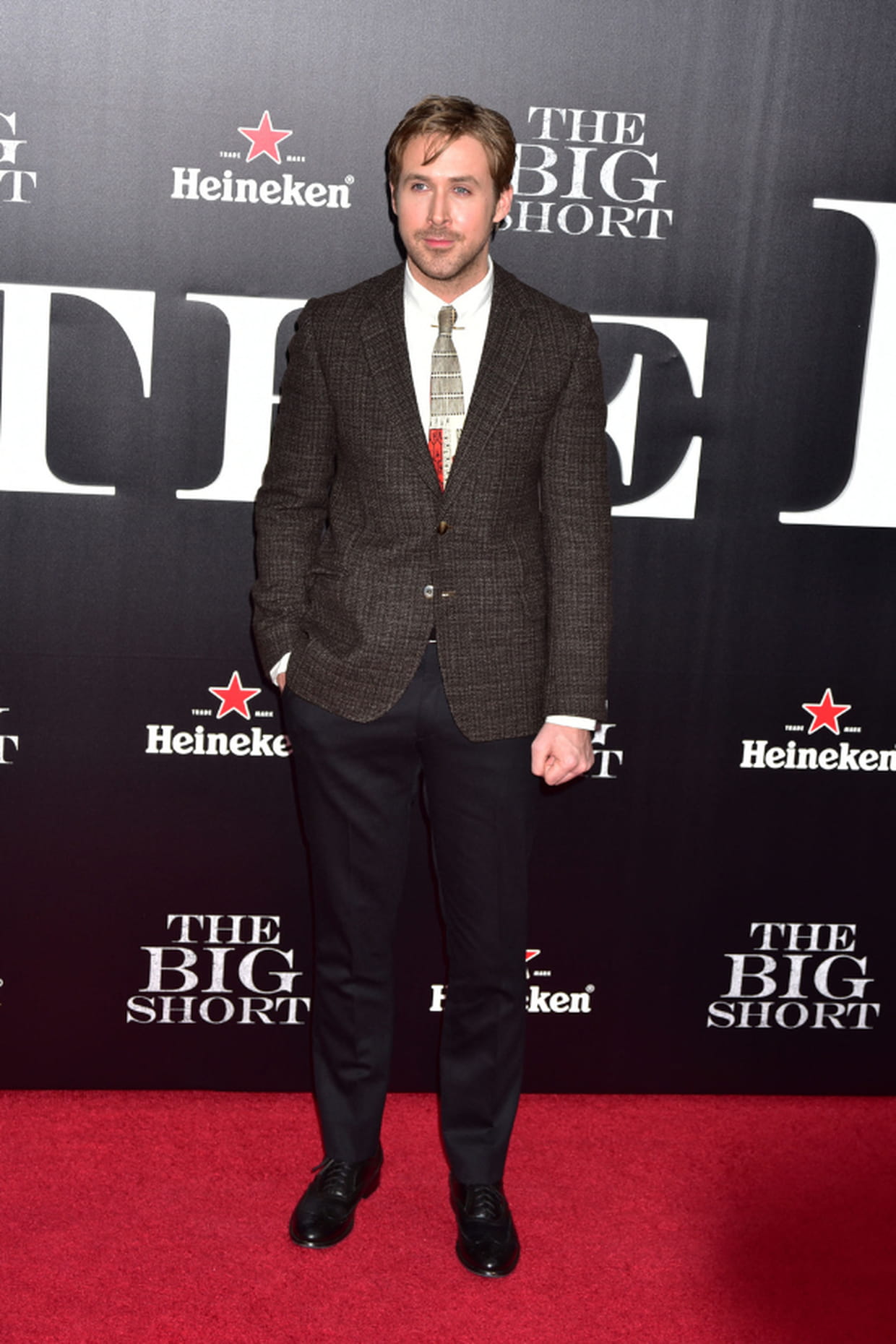 Ryan Gosling en cravate originale et costume noir lors du photocall du film The Big Short à New York le 23 novembre 2015.