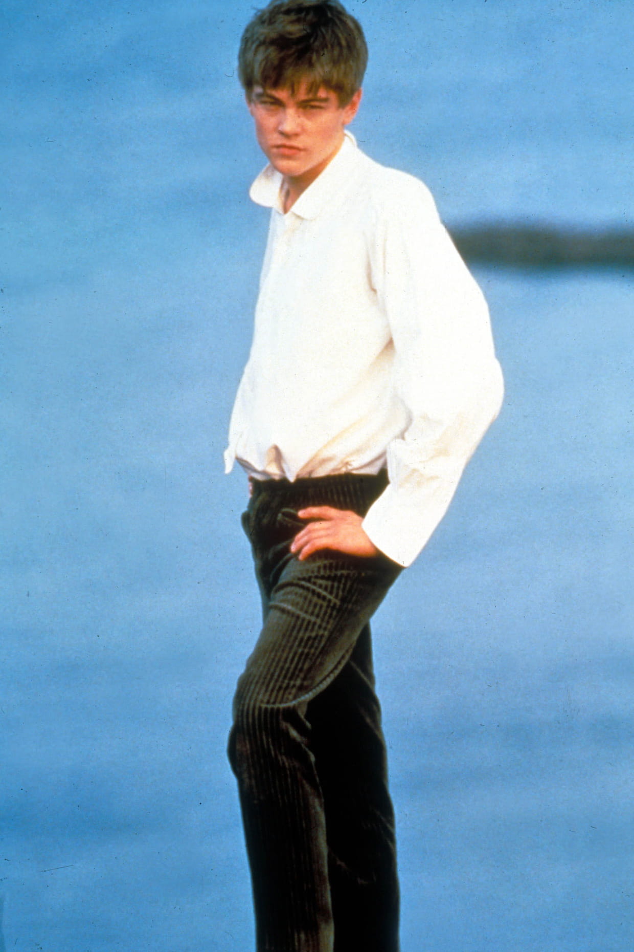 Leonardo DiCaprio en chemise blanche et pantalon droit lors d'un tournage le 31 novembre 1995.