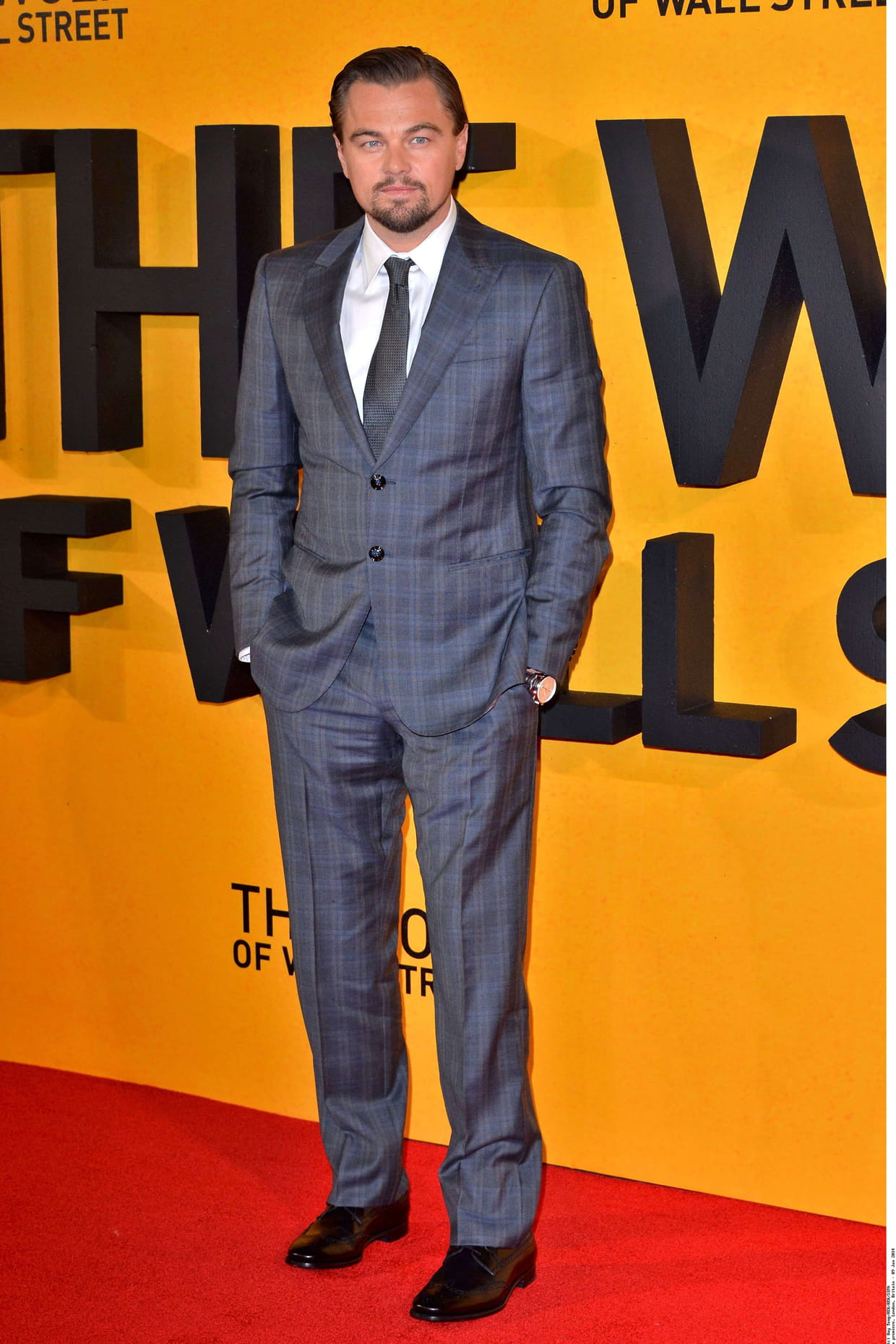 Leonardo DiCaprio en costume gris à rayures lors de l'avant-première du film Le loup de Wall Street à Londres le 9 janvier 2014.