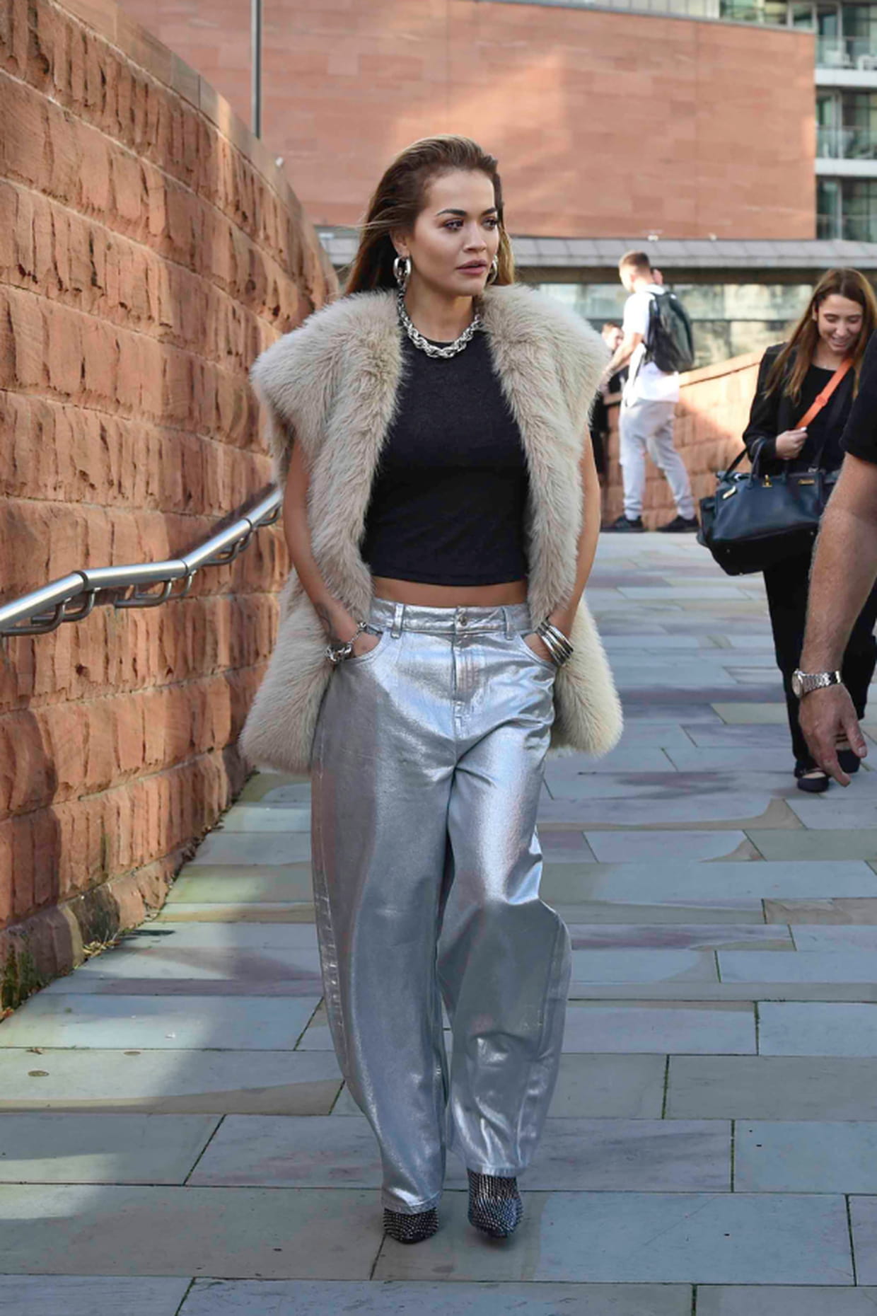 Rita Ora en pantalon métallique argenté à Manchester le 13 octobre 2023.