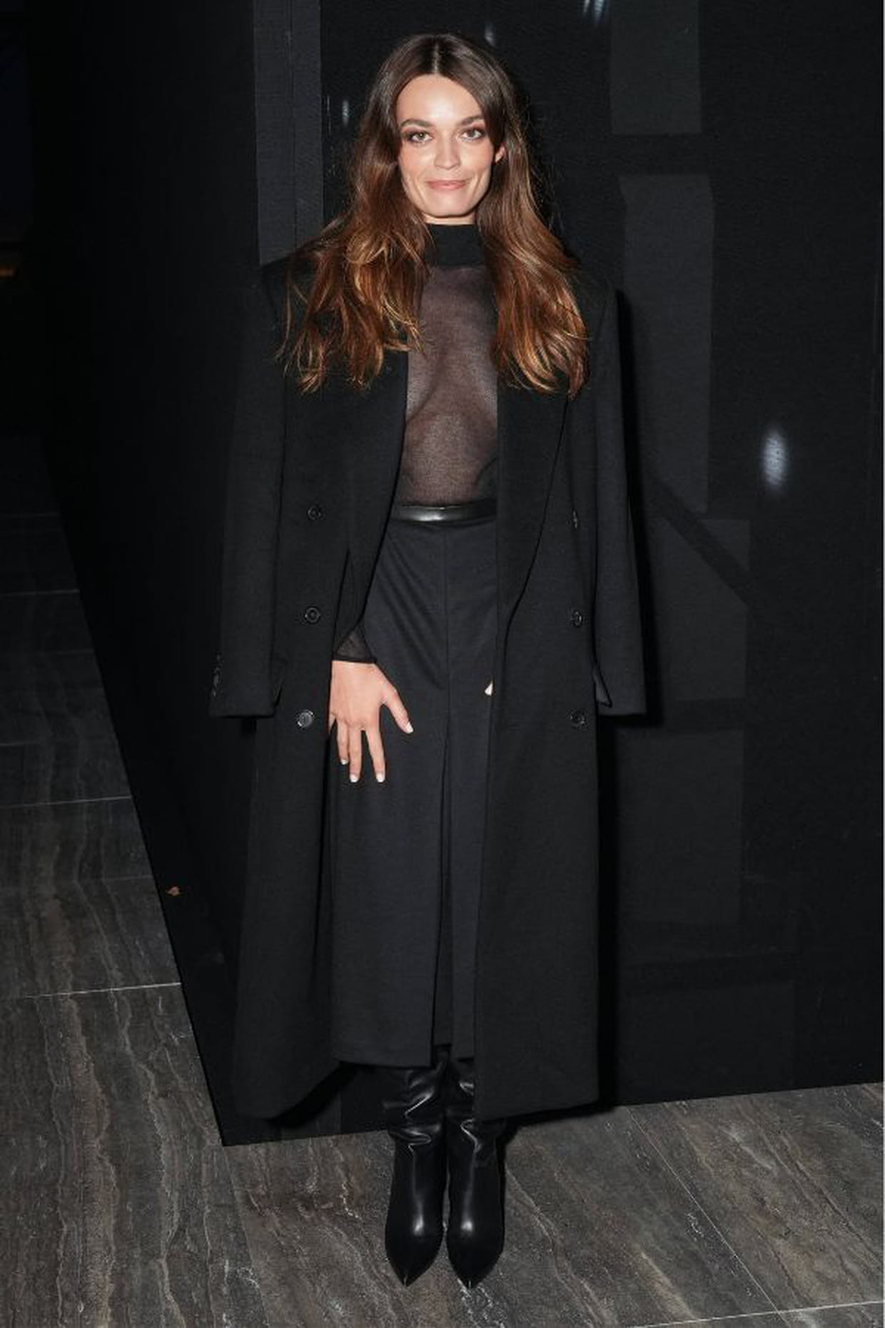 Emma Mackey en jupe noire et top transparent au défilé Saint Laurent lors de la fashion week printemps-été 2024 à Paris le 26 septembre 2023.