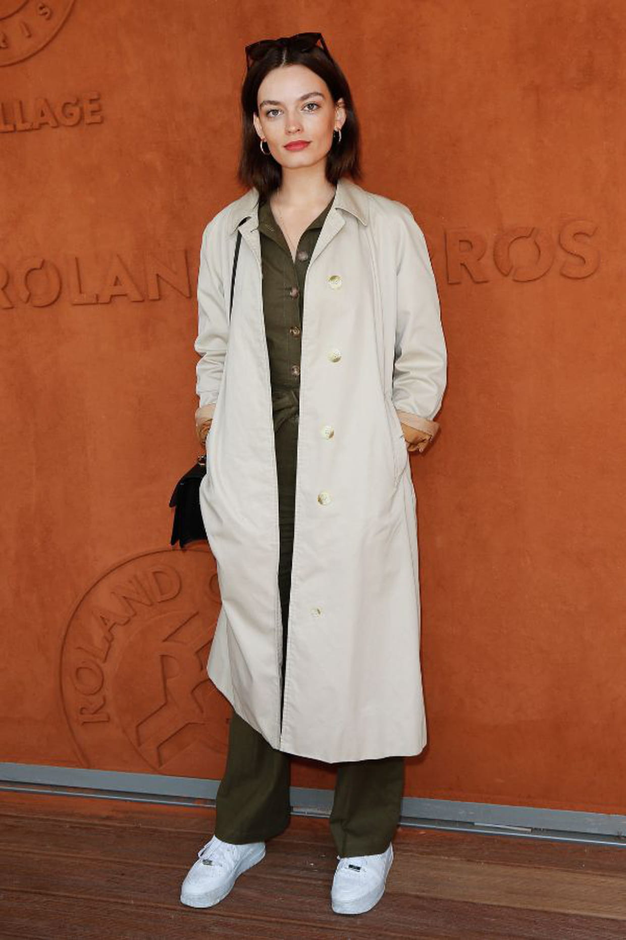 Emma Mackey en trench beige lors du tournoi de tennis de Roland-Garros à Paris le 8 juin 2019.