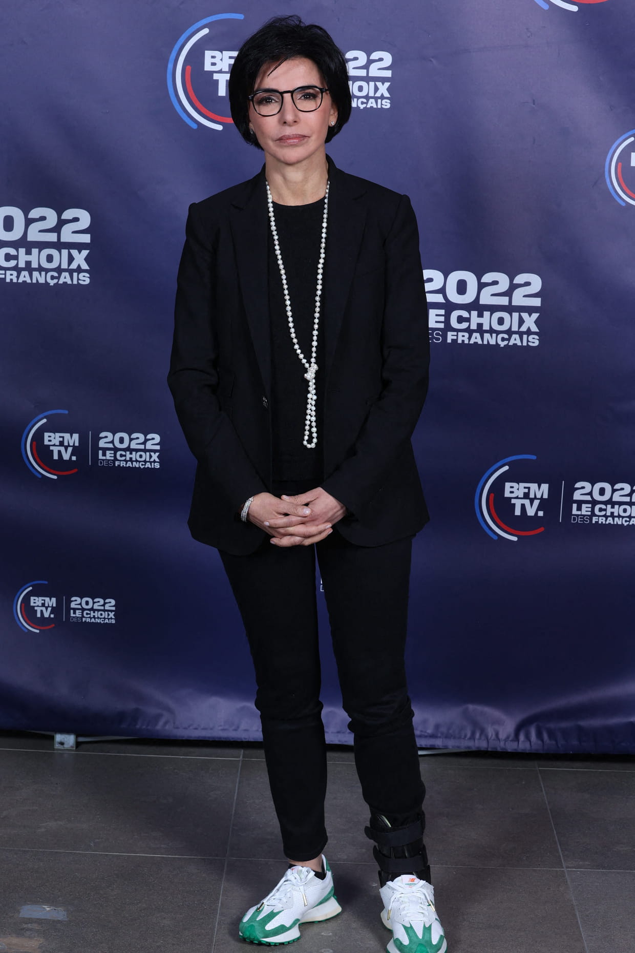 Rachida Dati en total look noir avec un tailleur et des sneakers lors de la soirée Le choix des Français organisé par BFMTV à Paris le 10 avril 2022.