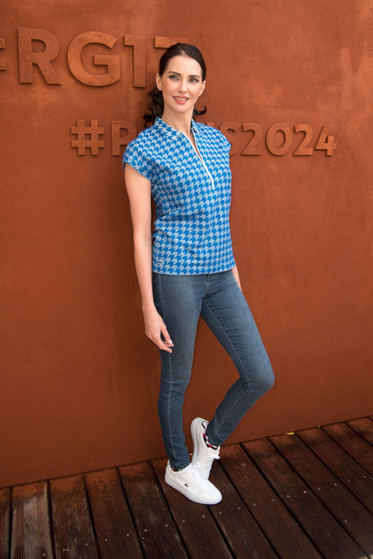 Frédérique Bel en top imprimé et jean slim au village de Roland-Garros à Paris le 6 juin 2017.