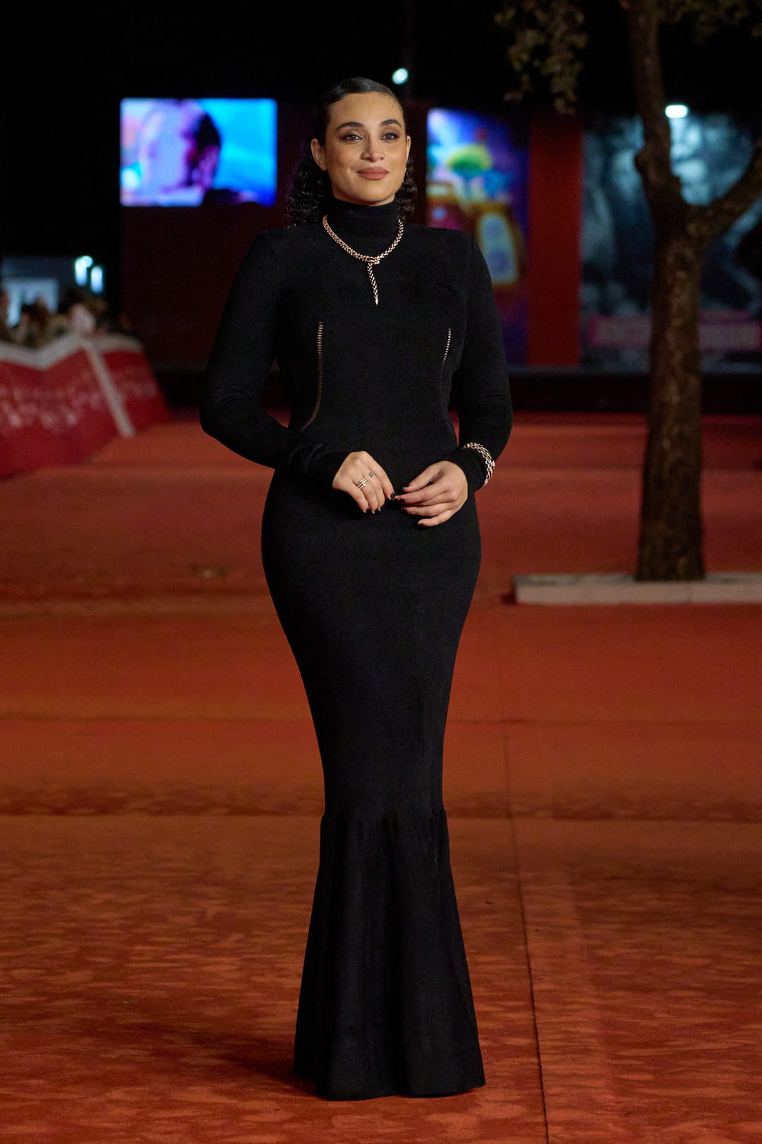 Sur le red carpet, Camélia Jordana se démarque également avec des tenues sophistiquées et sculpturales. On l'a par exemple aperçue lors d'un défilé Givenchy en robe longue moulante drapée vert fluo. Sur le tapis rouge du Festival du film de Rome, elle avait préféré une longue robe noire à col roulé. En janvier 2024, à l'occasion du Dîner de la mode, Camélia Jordana est apparue vêtue d'une jupe longue noire et d'un crop top en forme de nœud papillon XXL. Osé !