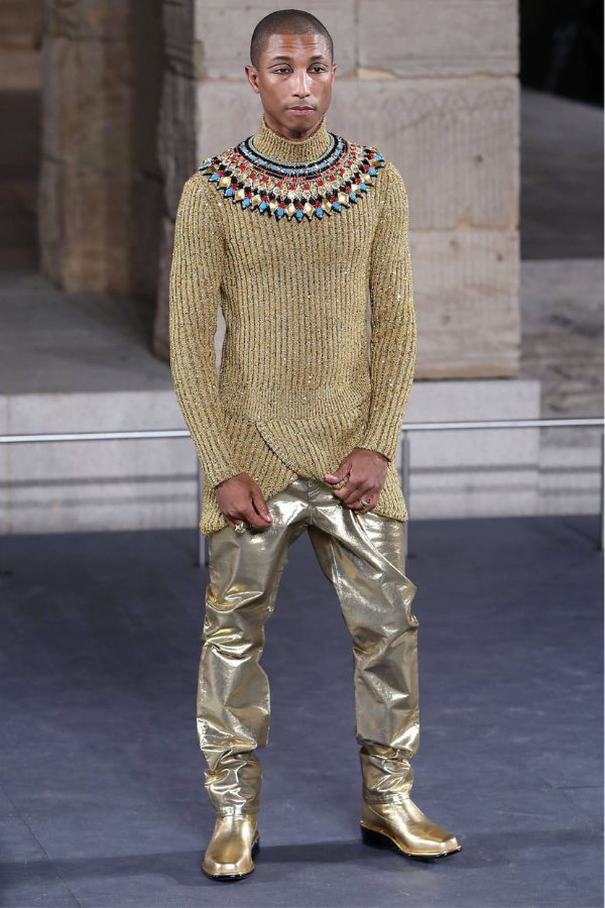 Pharrell Williams en pantalon doré et grosse maille ocre au défilé Chanel Métiers d'art 2018-2019 à New York le 4 décembre 2018.