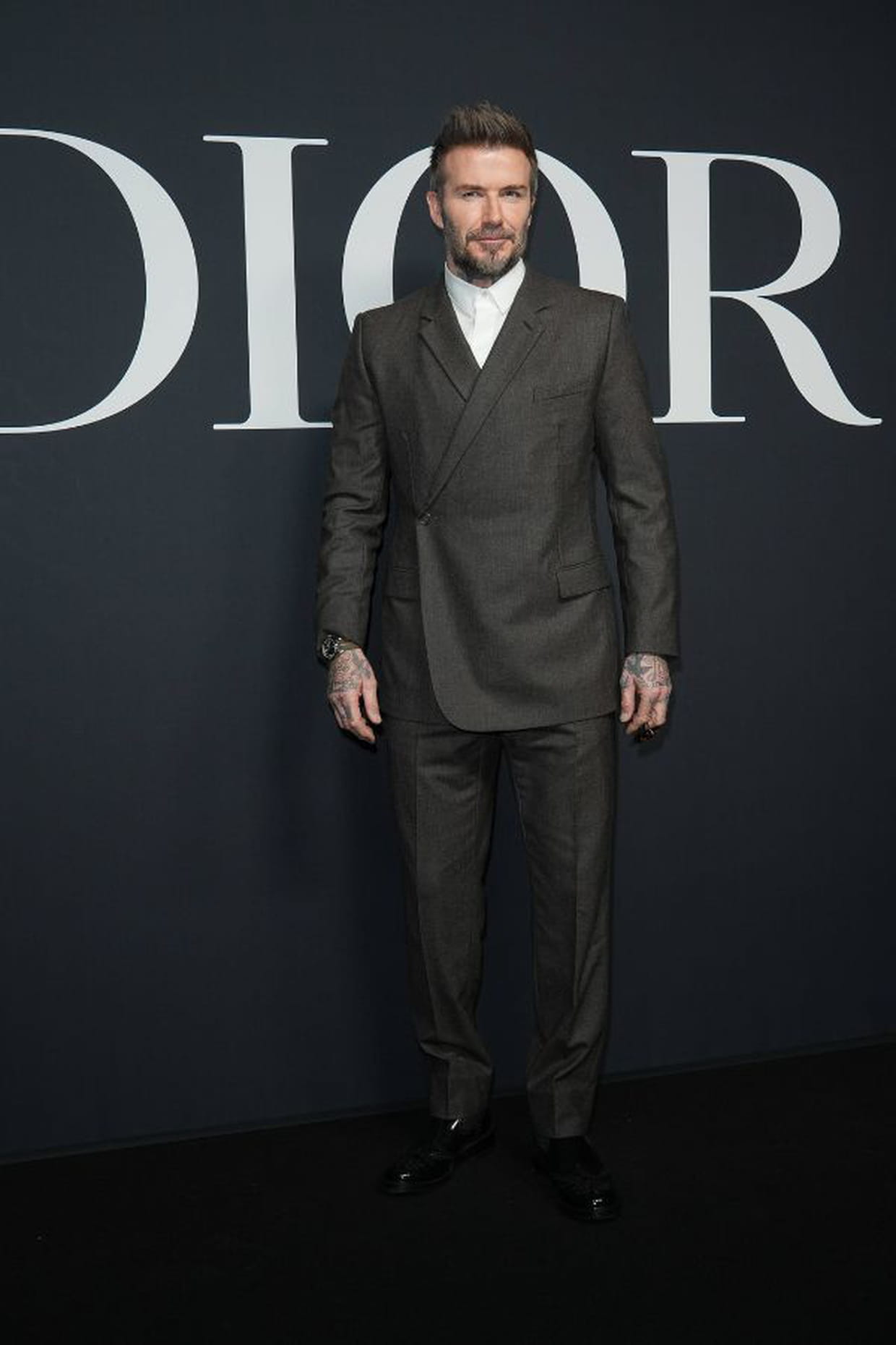 David Beckham en costume gris et chemise blanche au défilé Dior lors de la fashion week automne-hiver 2023-2024 à Paris le 20 janvier 2023.