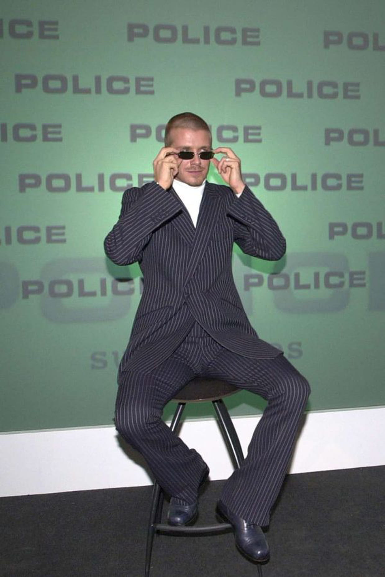 David Beckham en costume à fines rayures à une soirée Police Sunglasses à Londres le 13 avril 2005.