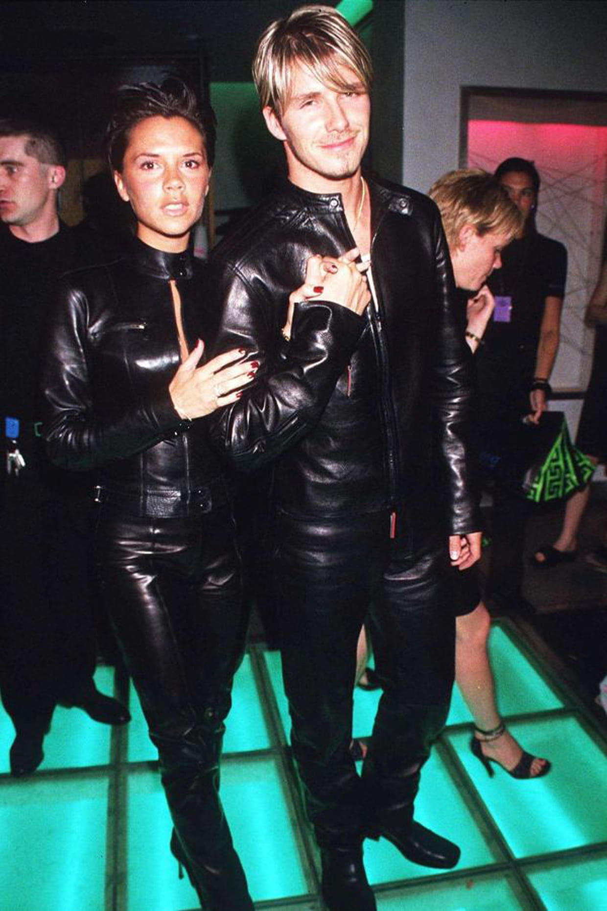 David Beckham en blouson en cuir avec Victoria Beckham à une soirée Versace à Londres le 15 juin 1999.
