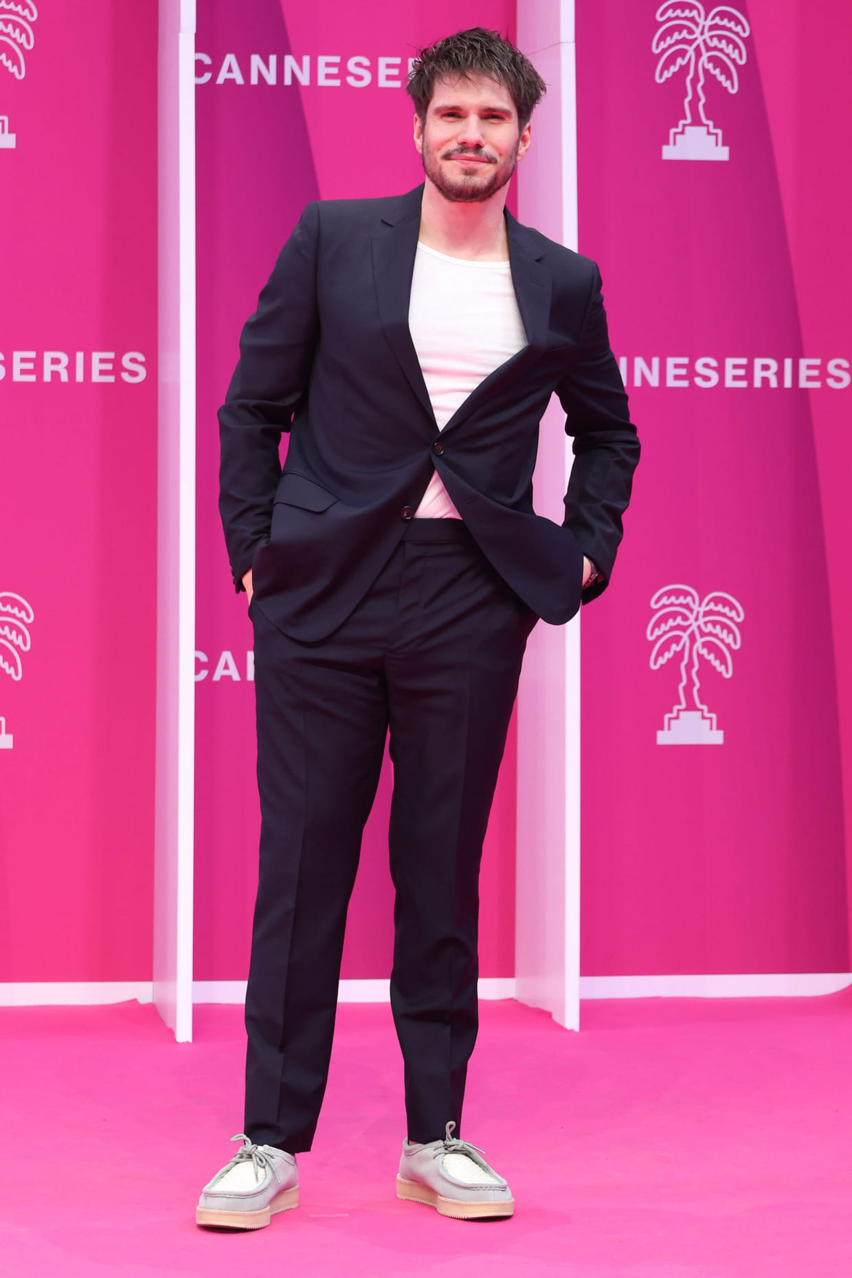 François Civil en costume noir et T-shirt blanc lors du Festival Cannes Series le 8 avril 2024.