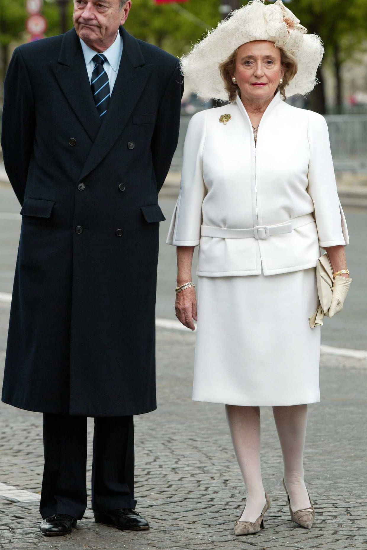 Bernadette Chirac en tailleur blanc et chapeau