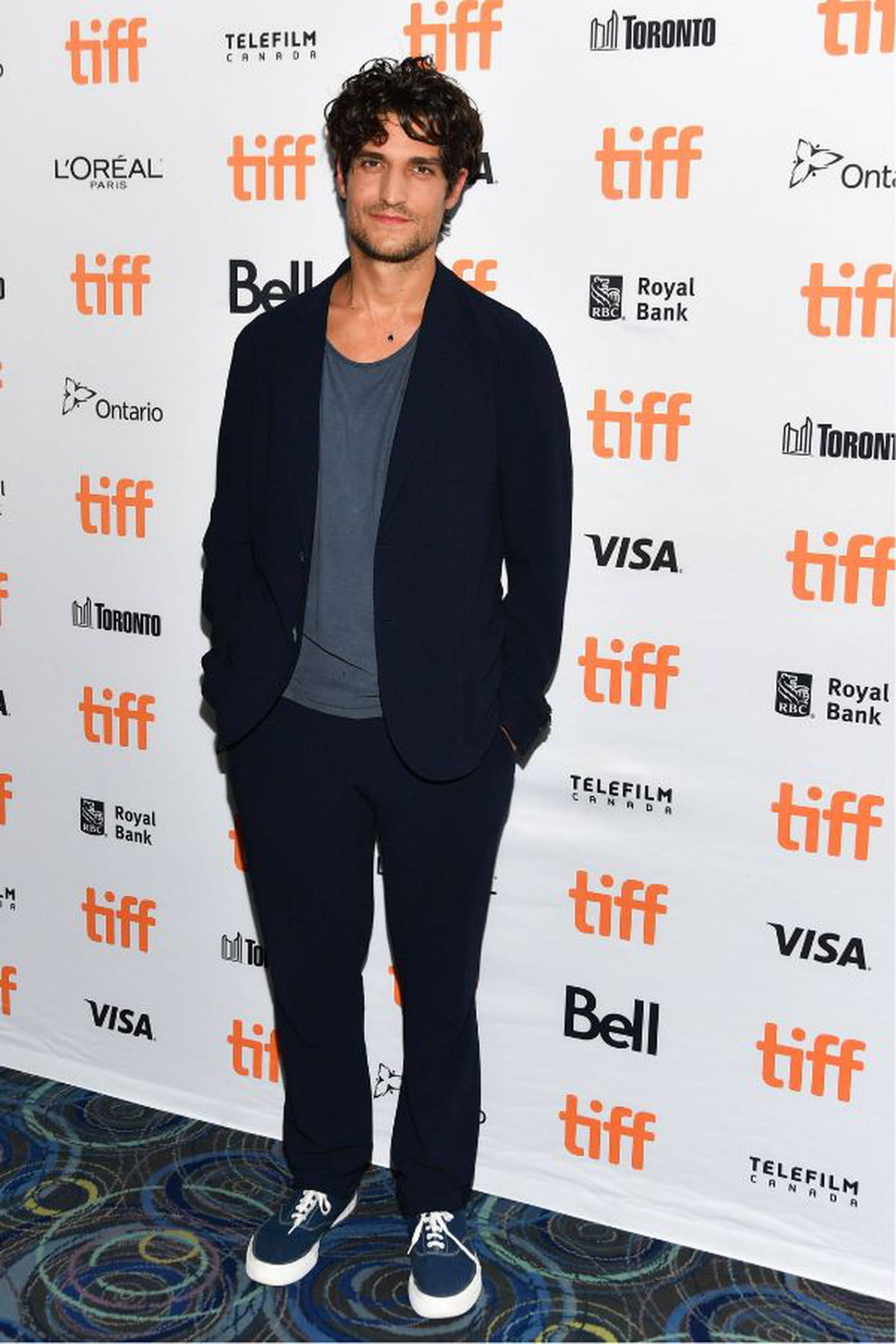 Louis Garrel en ensemble bleu marine et T-shirt gris à l'avant-première du film L'homme fidèle à Toronto le 9 septembre 2018.