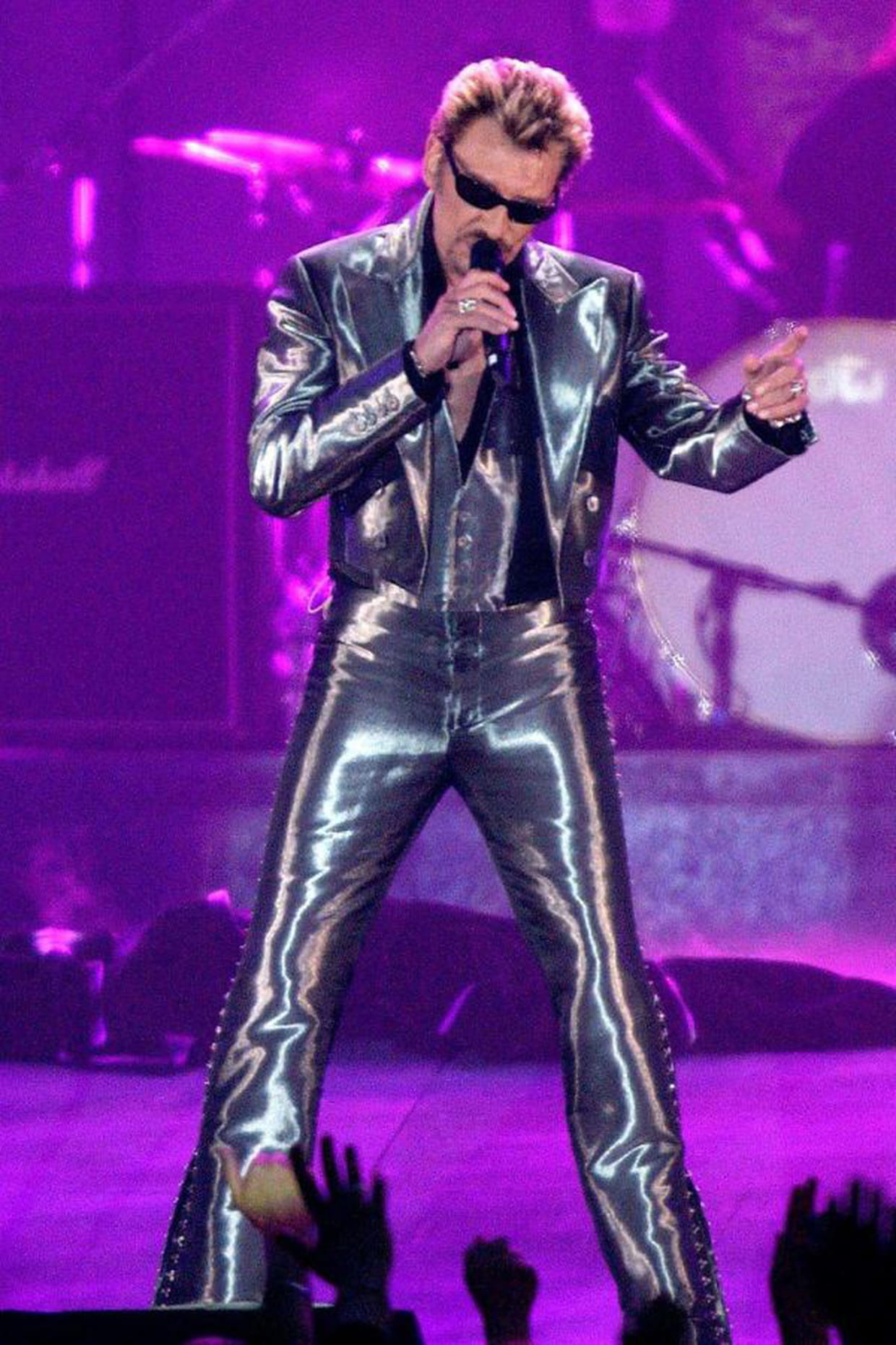 Johnny Hallyday en ensemble lamé argenté à un concert à Paris le 10 juin 2003.