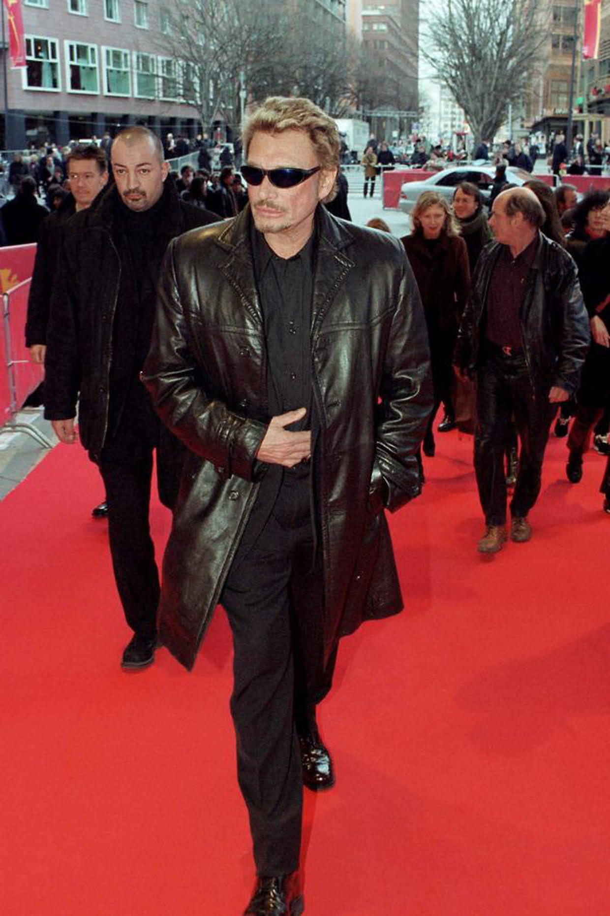 Johnny Hallyday en ensemble noir et veste longue en cuir à la projection du film Love Me lors d'un Festival à Berlin le 16 février 2000.