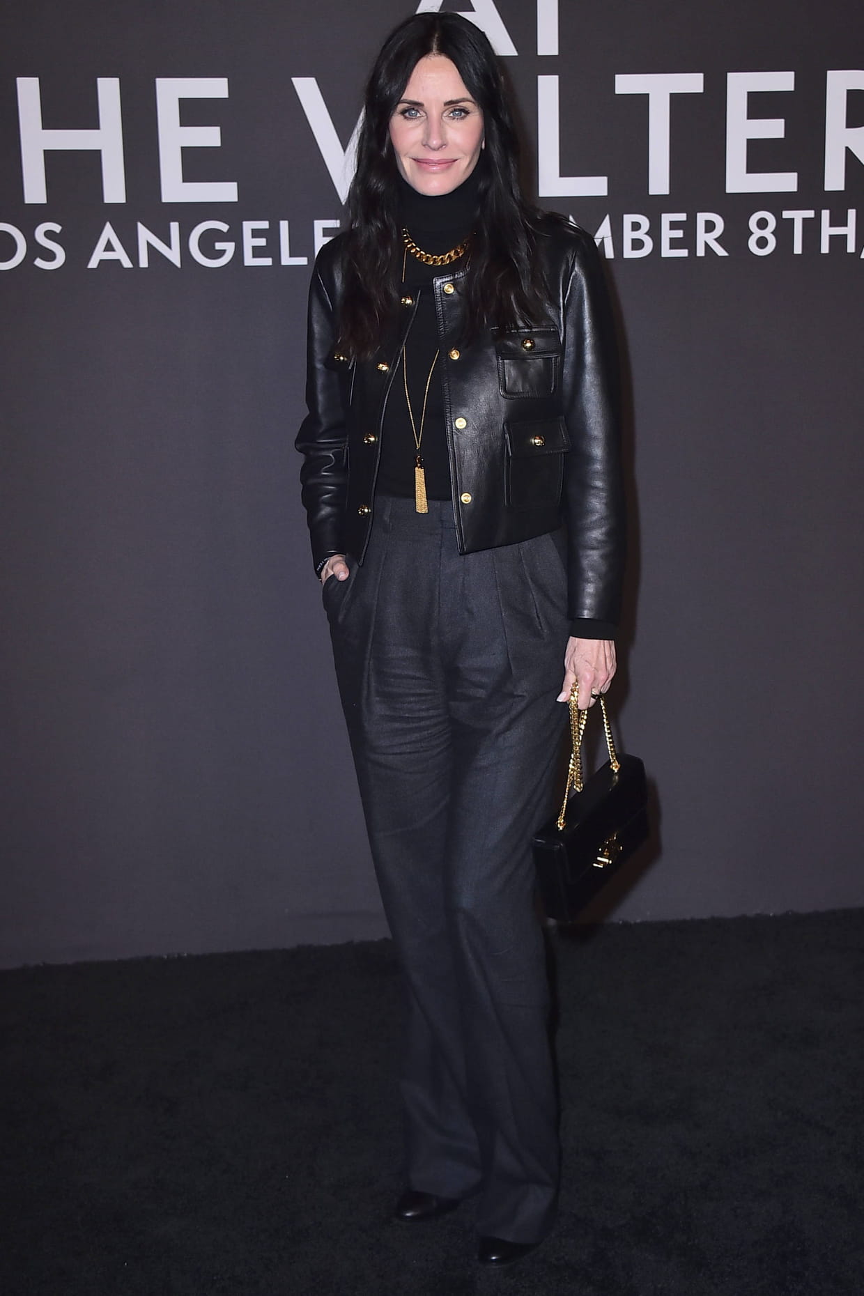 Courteney Cox en veste courte en cuir noir et pantalon à pinces