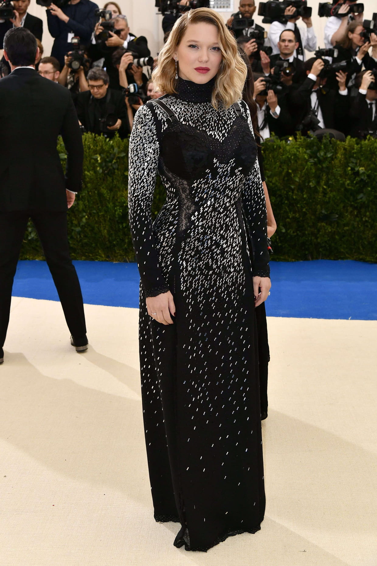 Léa Seydoux en robe longue noire à strass lors du Met Gala de New York le 1ᵉʳ mai 2017.