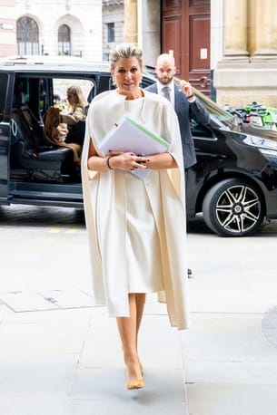 Maxima des Pays-Bas en robe et cape blanche Natan lors d'une visite à Londres, le 4 décembre 2024.