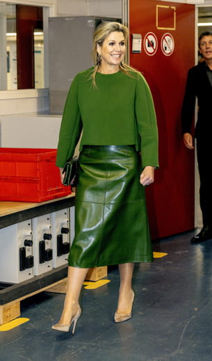 Maxima des Pays-Bas en jupe en cuir vert et top Natan, escarpin en daim beige Gianvito Rossi et boucles d'oreilles Ole Lynggaard Copenhagen lors de la réunion d'anniversaire de l'entreprise de haute technologie Priva à De Leir, le 13 novembre 2024.