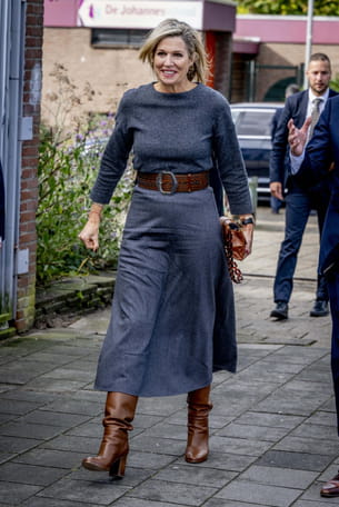 La Reine Maxima en robe grise Natan accessoirisé d'une ceinture Etro, et des bottes marrons Gianvito Rossi à la réunion de la municipalité d'Arnhem, le 10 octobre 2024.
