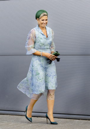 Maxima des Pays-Bas en robe à fleurs Natan, manteau vert Max Mara et escarpins en cuir assorti Gianvito Rossi, à l'inauguration de la nouvelle usine de NX Filtration à Hengelo, le 11 septembre 2024.