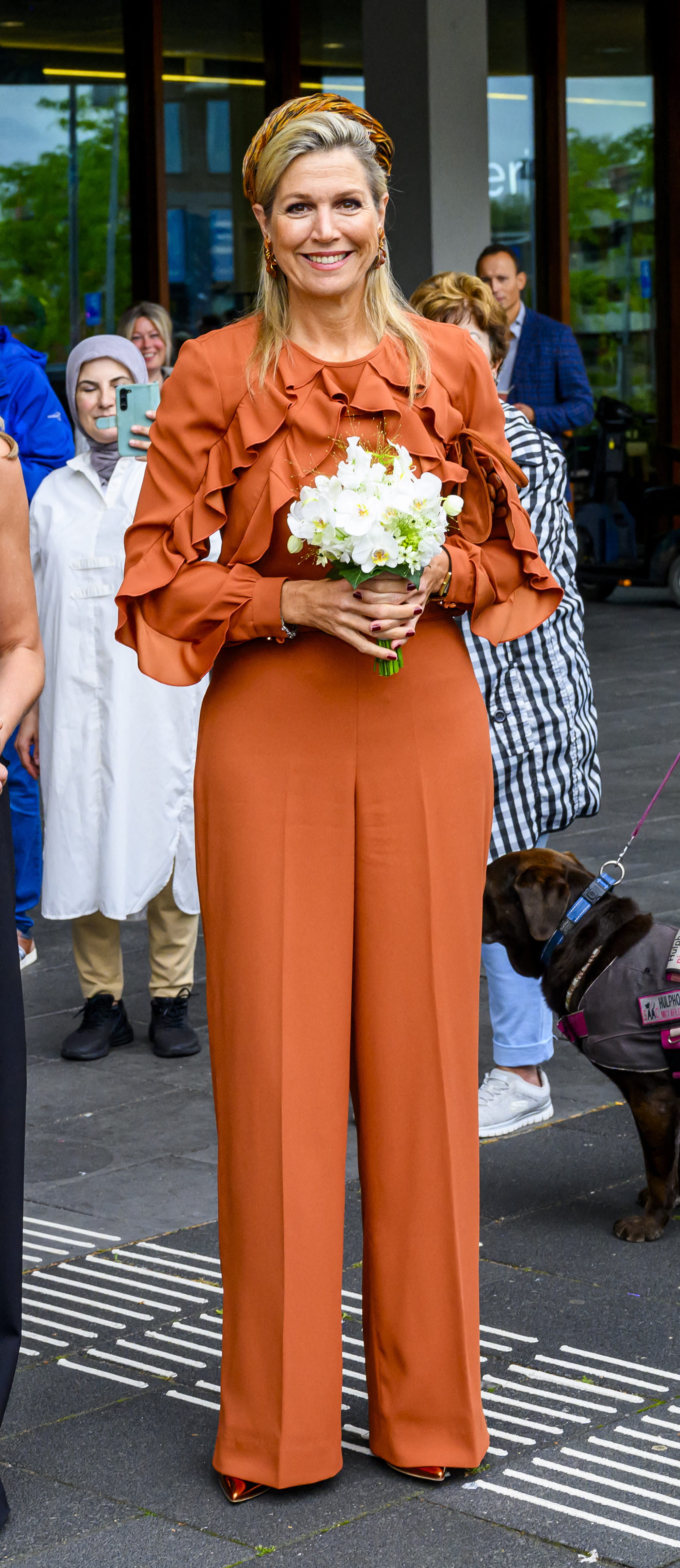 La Reine Maxima en combinaison orange Claes Iversen et escarpins brillant assorti Gianvito Rossi lors de l'ouverture de l'hôpital Reiner de Graaf à Delft, le 10 septembre 2024.