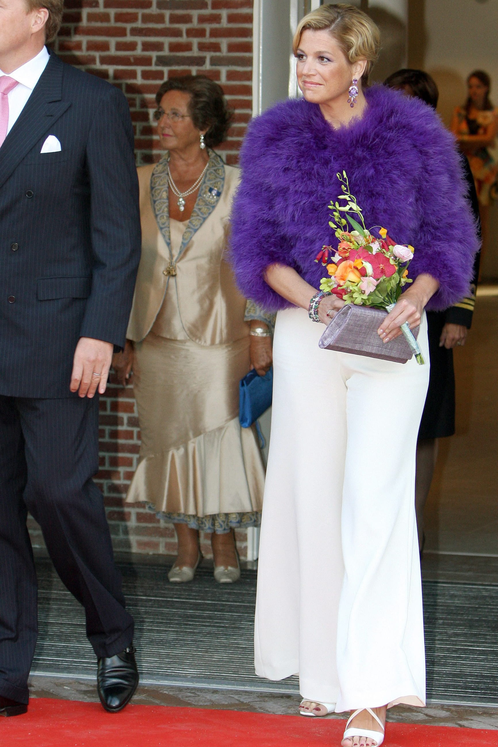 Maxima des Pays-Bas en pantalon large blanc, escarpins assortis et veste en fourrure violette à l'ouverture du musée de l'Ermitage d'Amsterdam, aux Pays-Bas, le 19 juin 2009.