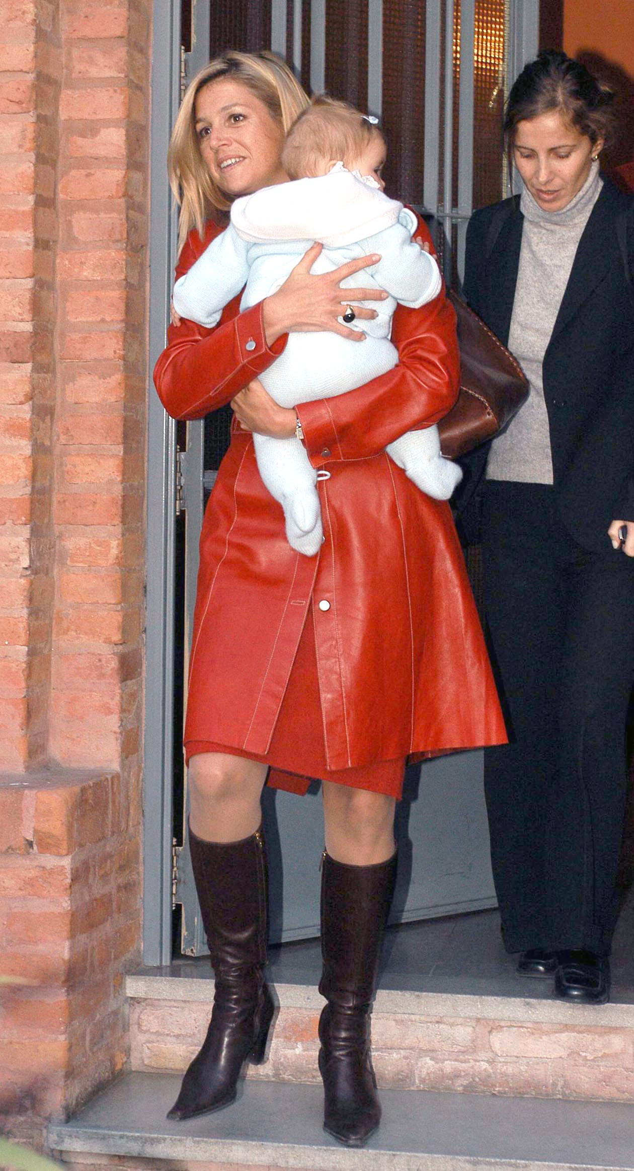 La reine Maxima des Pays-Bas en robe et veste en cuir rouge, bottes hautes marron et sac assorti lors d'une visite à sa famille avec sa fille, la princesse Catharina-Amalia, à Buenos Aires, le 10 août 2004.