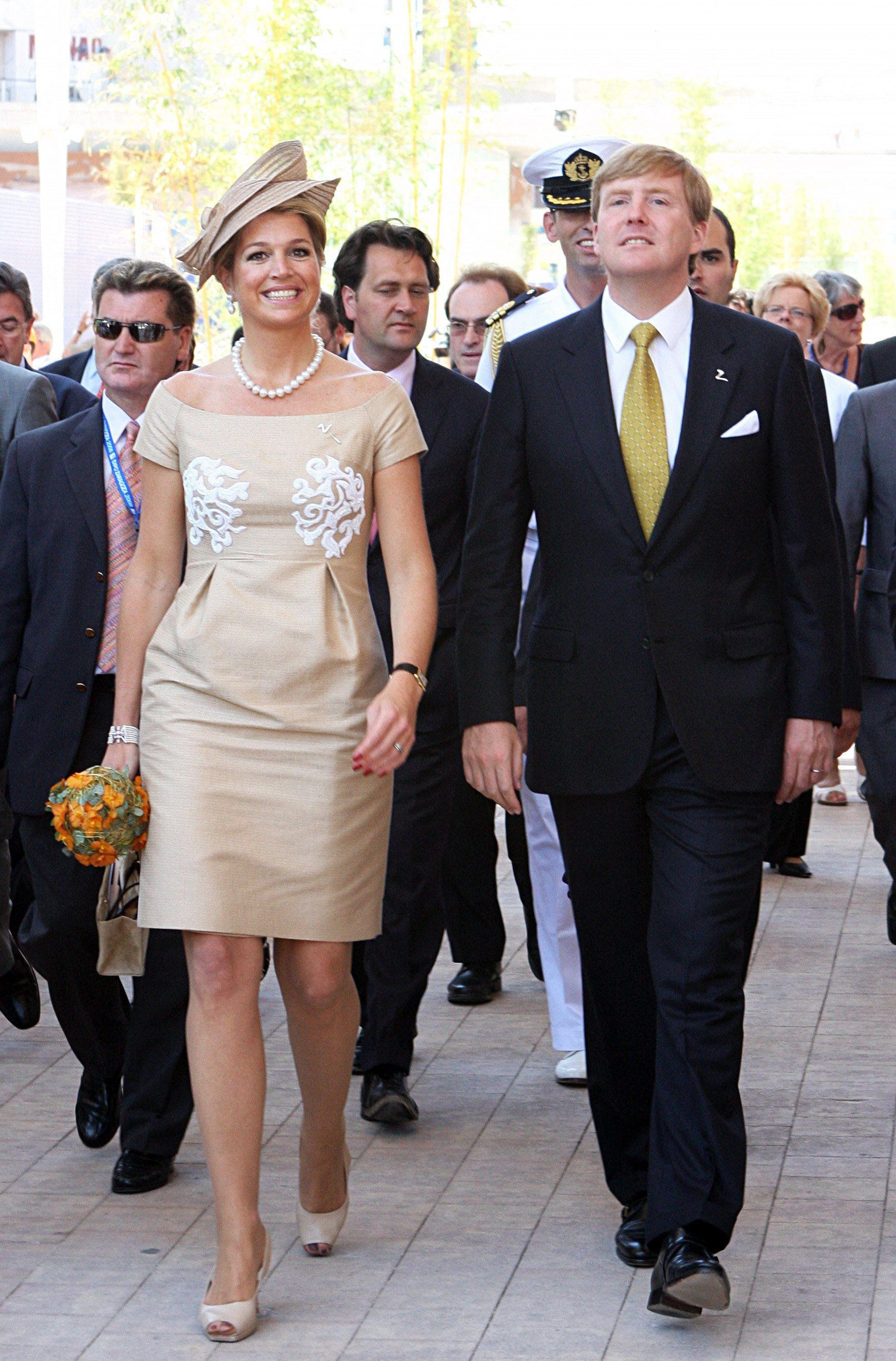 La reine Maxima en robe à épaules dénudées beige, chapeau et escarpins assortis, à la cérémonie d'ouverture du pavillon néerlandais à l'Expo 2008 à Saragosse, en Espagne, le 25 juin 2008.
