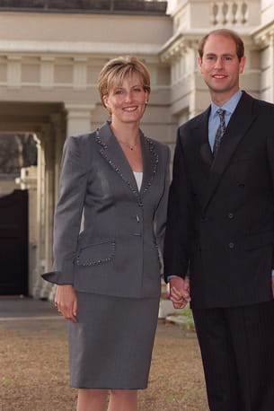 Sophie d'Edimbourg en tailleur jupe gris orné de cristaux lors de l'annonce de ses fiançailles avec Edward, duc d'Edimbourg, le 6 janvier 1999 à Londres.