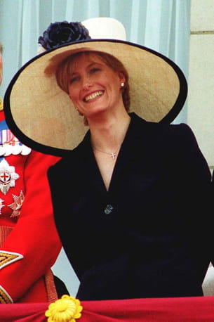 Sophie d'Edimbourg avec son chapeau géant beige et noir à fleurs sur le balcon de Buckingham Palace à Londres après l'événement Trooping the Colour le 12 juin 1999.