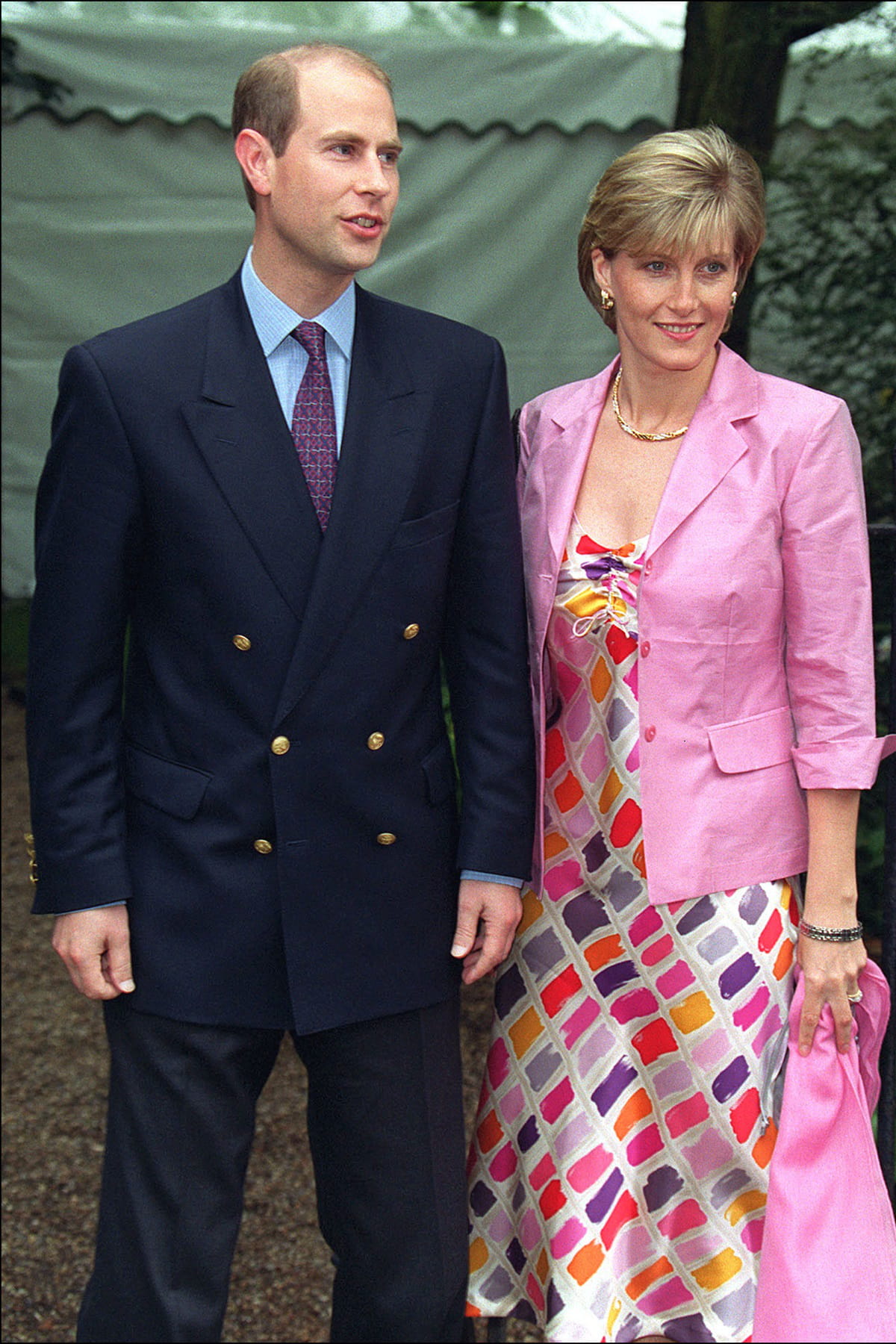 Sophie d'Edimbourg en robe satinée colorée, avec une veste et une étole roses, à Londres en arrivant à la soirée organisée par David Frost le 5 juillet 2000.