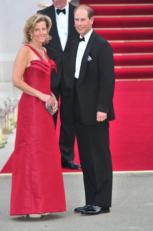 Sophie d'Edimbourg en longue robe rouge Bruce Oldfield et escarpins nude