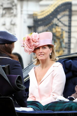 Sophie d'Edimbourg en robe rose, avec son grand chapeau à fleurs coordonné, lors de la parade de l'événement Trooping the Colour à Londres le 11 juin 2011.