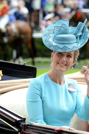 Sophie d'Edimbourg en robe bleu turquoise évasée Emilia Wickstead et son chapeau de la même couleur à l'hippodrome d'Ascot dans le Berkshire, le 15 juin 2016.