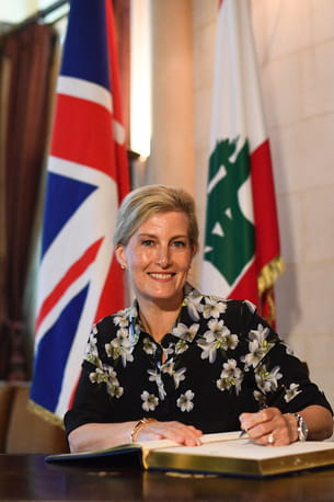 Sophie d'Edimbourg en robe noire à fleurs blanches et col ouvert de Suzannah, pour sa rencontre avec le Premier ministre du Liban Saad Hariri à Beyrouth, le 13 juin 2019.
