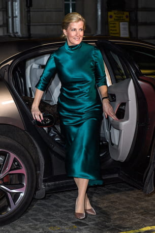 Sophie d'Edimbourg en robe satinée couleur vert canard Galvan London, à l'avant-première du film Sulphur and White à Londres le 27 février 2020.