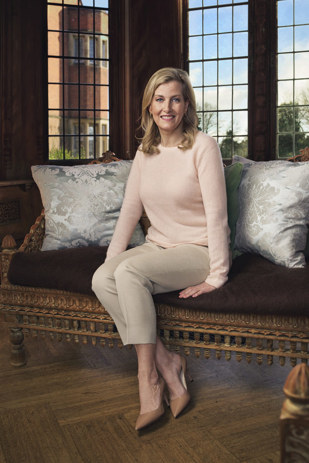 Sophie d'Edimbourg en camaïeu de couleur crème, avec son pull à manches longues, son pantalon 3/4 et ses escarpins, photographiée dans sa résidence de Bagshot Park, dans le comté de Surrey, pour The Sunday Times Magazine le 28 mai 2020.