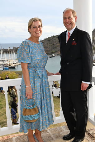 Sophie d'Edimbourg en robe bleue à fleurs jaunes et blanches de Soler London, avec son sac "Capri" de Sophie Habsburg, sur le balcon de la Clarence House avec son époux à Antigua-et-Barbuda, pays dans les Caraïbes le 25 avril 2022.