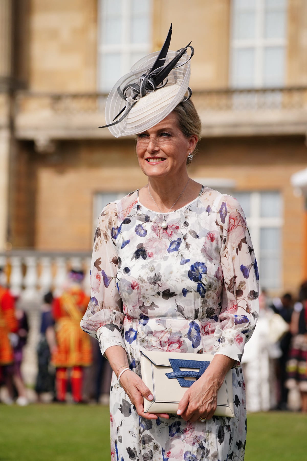 Sophie d'Edimbourg en robe fleurie Erdem, avec sa pochette Sophie Habsburg et son chapeau Jane Taylor, à la Garden Party royal de Buckingham Palace à Londres le 18 mai 2022.