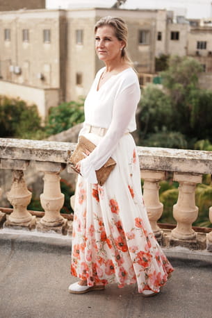 Sophie d'Edimbourg en jupe longue et fleurs rouges Zimmermann, agrémentée d'une blouse blanche accordée, le 9 octobre 2024 lors d'une visite de la Villa Guardamangia à Pieta, Malte.