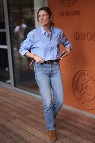 Isabelle Ithurburu en chemise bleue rayée Lacoste rentrée dans une paire de jeans délavée, avec une ceinture marron et des santiags couleur camel à Roland-Garros le 5 juin 2024.