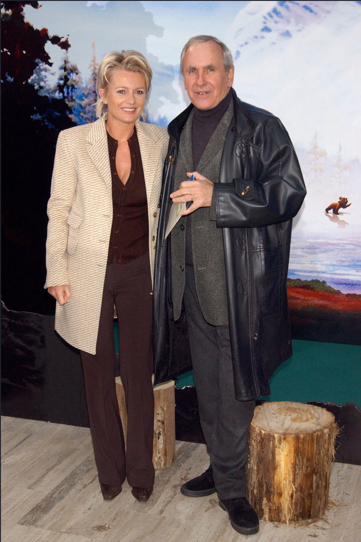 Sophie Davant en ensemble chocolat, avec une chemise au col tunisien, un pantalon droit et des bottines, surmonté d'un manteau beige à Paris pour la projection du film Disney Frère Des Ours le 17 janvier 2004.